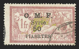 1115 p Yvert #56A var. ImageYvert #56A var., 1920 100P on 5Fr. Dark blue and buff, with double black fleuron ovpt., tied to piece by Alep c.d.s. (stamp has been lifted for examination and hinged back in place), rich color, very fine; an immensely rare variety and especially difficult to find used; 2000 Behr certificate; ex-Gibralter; priced only mint in Yvert (Scott #72a; $4,300.00). (Image) for mint €4,500