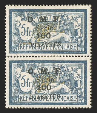 1109 og Yvert #43a ImageYvert #43a, 1920-22 100pi on 5Fr. Blue and buff, "PIASRTES" error, vertical pair, the bottom stamp being the error, the top stamp normal, well centered and with fresh colors, o.g., small central h.r., very fine; a rare error that is especially desirable in this se-tenant format; 2001 Calves certificate (Scott #53a; $1,900.00+). (Image) €2,740+