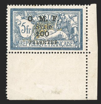 1110 og Yvert #43a ImageYvert #43a, 1920-22 100pi on 5Fr. Blue and buff, "PIASRTES" error, another example of this rare error, being a bottom right corner margin single, bright color on fresh paper, o.g., lightly hinged, mild natural gum bend, light blue (printing?) marks at right, otherwise very fine; signed Roumet (Scott #53a; $1,650.00). (Image) €2,400