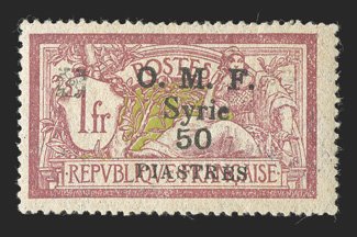 1111 og Yvert #55A ImageYvert #55A, 1920 50pi on 1Fr. Light red and olive, black fleuron overprint, o.g., h.r.'s, fine; signed Calves (Scott #71; $650.00). (Image) €900