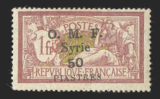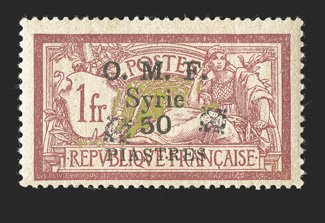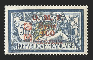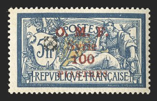 1116 og Yvert #56B var. ImageYvert #56B var., 1920 100pi on 5Fr. Blue and olive, double red fleuron overprint, a desirable mint example of this very rare error, particularly fresh, o.g., l.h., nearly very fine; a stamp which very seldom makes an auction appearance; signed A. Brun; ex-"Derby", Gross (Scott #81a; $3,500.00). (Image) €4,500