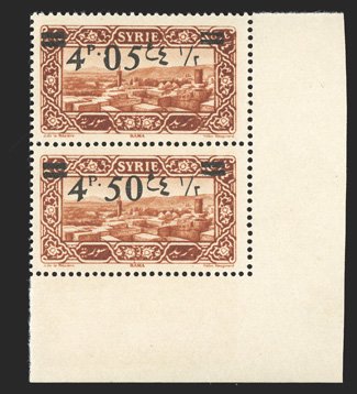 1118 nh Yvert #181b ImageYvert #181b, 1926 4.50pi on 75c Orange brown, error "4p.05", striking bottom right corner margin vertical pair, the top stamp being the error, well centered and exceedingly fresh, o.g., n.h., extremely fine (Scott #192 var.). (Image) for hinged €330+