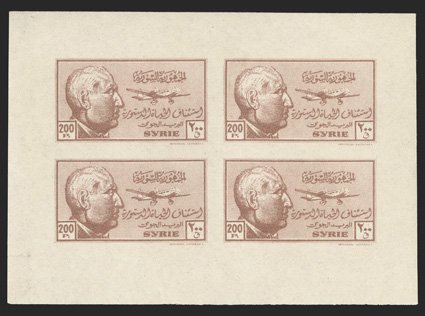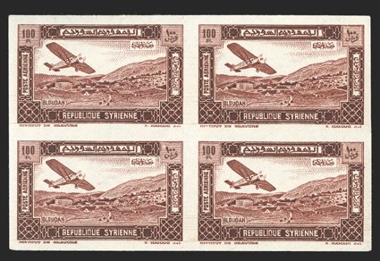 1132 nhbl Yvert #PA60-69 var. ImageYvert #PA60-69 var., 1934 50c-100pi Air Post, imperforate cplt. in blocks of four, large margins all around, vibrant colors, o.g., n.h., three values have a single small toned spot, 10pi has a small nick in the margin, these imperfections are quite trivial, overall a very fine and handsome set of imperforate blocks; only 100 imperforate stamps were made, making blocks such as these especially scarce (Scott #C57-66 var.). (Image) for hinged €8,000+