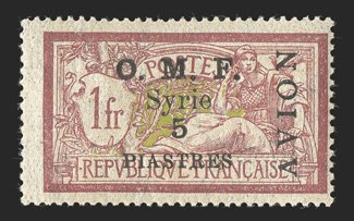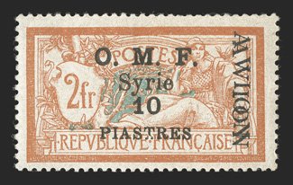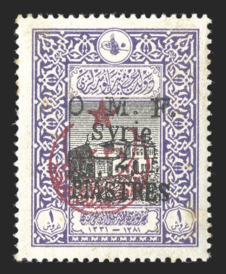 1139 og Yvert Ain Tab #7 ImageYvert Ain Tab #7, 1921 2pi on 1pi Violet, with black surcharge, well centered, fresh colors, o.g., n.h. but with ink mark on gum, slight toned spot at bottom right, otherwise a very fine example of this rare stamp. (Image) €1,600