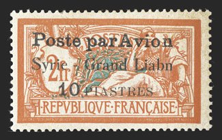 1125 og Yvert #PA9a ImageYvert #PA9a, 1921 10pi on 2Fr. Orange and green, double "AVION", attractive colors, o.g., small h.r., very fine; a scarce air post error; signed Champion (Scott #C9a; $475.00). (Image) €750