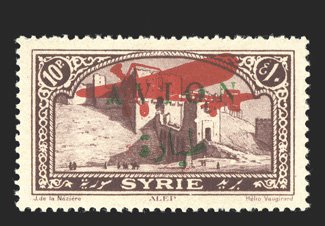 1126 og Yvert #PA14a-17a ImageYvert #PA14a-17a, 1923 2pi on 40c to 10pi on 2Fr., with "Liabn" error cplt., brilliant colors throughout, o.g., lightly hinged, just the faintest trace of gum toning in a few places, fine-very fine; rare, as only 30 of each were printed (Scott #C14a-17a; $1,600.00). (Image) €3,000