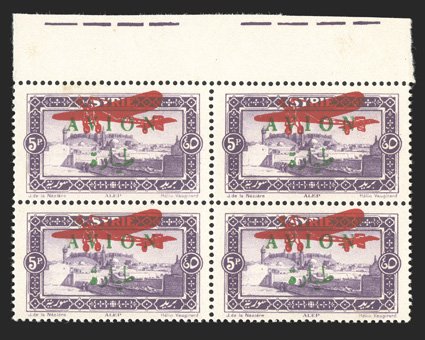 1128 nhbl Yvert #PA32 var. ImageYvert #PA32 var., 1926 5pi with red airplane overprint on green "AVION" overprint, top sheet-margin block of four, excellent centering, vibrant colors, o.g., n.h., extremely fine; only 200 were printed (Scott #C32 var.). (Image) for hinged €720+