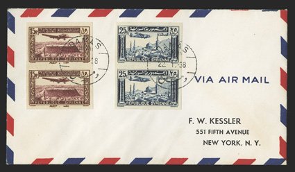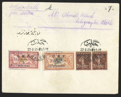 1130 c Yvert #PA4-6 ImageYvert #PA4-6, 1921 1pi on 20c to 10pi on 2Fr. Air posts cplt., with a pair of the 1pi on 20c and singles of the other two, all tied by Haleb 22.9.21 c.d.s. postmarks on airmail cover to Alexandrette (receiving backstamp), cover opened at bottom, fine (Scott #C4-6). (Image) Est. $200-300