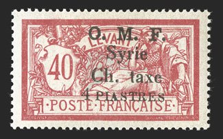 1136 og Yvert #TT4a ImageYvert #TT4a, 1920 "4 PIASTRES" surcharge on 40c Red and pale blue, thin "4", unusually well centered, bright fresh colors, o.g., minor h.r., very fine (Scott #J4 var.). (Image) €500