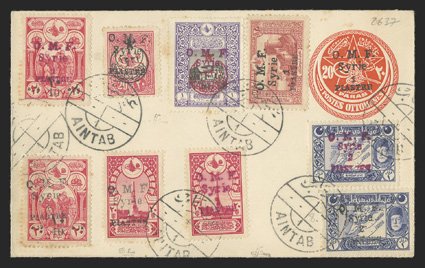 1138 c Yvert Ain Tab #1/8 ImageYvert Ain Tab #1/8, 1921 1pi and 2pi Ain Tab surcharges, seven different listed values including the rare 2pi on 1pi Violet (Yvert #3), as well as two unlisted values, these being two different 20pa designs, all tied to unaddressed 1pi on 20pa entire by Aintab c.d.s. postmarks, a few light toned specks of little consequence, otherwise very fine; the listed items catalog €3,390 simply as used stamps, with the two unlisted stamps being very rare; signed Calves, J-F Brun twice. (Image) Est. $2,000-3,000
