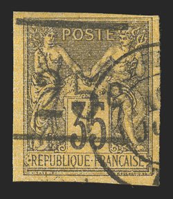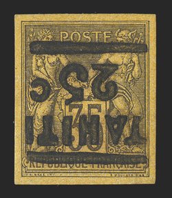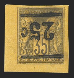 1142 og Yvert #1a ImageYvert #1a, 1882 "25c" Surcharge on 35c Dark violet on orange, inverted surcharge, superb bottom left corner margin single, with large to huge margins on the other two sides, remarkably fresh, o.g., l.h., an extremely fine gem; signed Calves, Champion and Roumet (Scott #1c; $500.00). (Image) €650