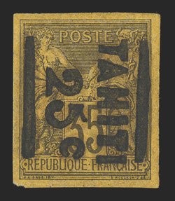1145 og Yvert #3a ImageYvert #3a, 1882 "TAHATI/25c" Surcharge on 35c Dark violet on orange, inverted surcharge, a handsome mint example of this very rare stamp, large equal margins all around, deep rich color, part o.g., extremely fine; one of only 50 stamps to receive this surcharge, including the errors; signed A. Brun, Calves and Roumet and accompanied by 2001 Calves certificate (Scott #1Ad; $4,600.00). (Image) €5,500