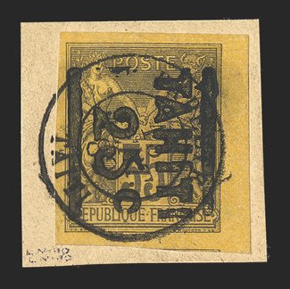 1143 og Yvert #2 ImageYvert #2, 1882 "25c" Surcharge on 40c Vermilion on straw, an incredibly fresh and choice mint example of this rarity, with vivid rich color on crisp clean paper, uniformly large margins all around, o.g., l.h., extremely fine; a mere 50 40c stamps received this surcharge, including the varieties, and many of these were used; signed Bernichon, Calves and Roumet (Scott #1B; $6,250.00). (Image) €7,500