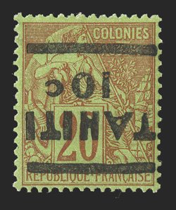 1148 og Yvert #5 ImageYvert #5, 1884 "TAHITI/10c" Surcharge on 20c Red on green, inverted surcharge, fresh and bright, o.g., trivial h.r., very fine; only 400 stamps were surcharged; signed A. Brun and Roumet (Scott #3a; $340.00). (Image) €420