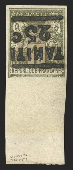 1149 og Yvert #6 ImageYvert #6, 1884 "TAHITI/25c" Surcharge on 1Fr. Bronze green on straw imperforate, inverted surcharge, wide bottom sheet-margin mint single, with generous even margins on the other three sides, rich color on fresh paper, o.g., l.h., extremely fine; only 850 stamps were surcharged; signed Bernichon three times, A. Brun, Miro twice, Pavoille and Roumet (Scott #4a; $750.00). (Image) €1,000