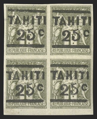 1151 og/nhbl Yvert #6 ImageYvert #6, 1884 "TAHITI/25c" Surcharge on 1Fr. Bronze green on straw imperforate, a highly desirable partial bottom sheet-margin mint block of four, with large even margins on the other three sides, wonderfully fresh, with rich color on crisp white paper, o.g., trivial h.r. at top, the bottom left stamp l.h. and the bottom right stamp n.h., extremely fine and choice; each signed Bernichon and additionally signed by Calves and Champion and accompanied by 2006 Roumet certificate (Scott #4; $3,000 for hinged singles). (Image) for singles €4,000+