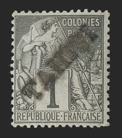 1152 og Yvert #7 ImageYvert #7, 1893 "TAHITI" Overprint on 1c Black on lilac blue, an incredibly well centered mint example that is also uncommonly fresh, o.g., minor h.r., extremely fine; only 200 stamps were overprinted; signed J-F Brun and accompanied by 2000 Brun and 2002 Roumet certificates (Scott #5; $950.00). (Image) €1,200