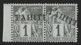 1154 og Yvert #7 ImageYvert #7, 1893 "TAHITI" Overprint on 1c Black on lilac blue, left sheet-margin horizontal pair, the right stamp with usual diagonal overprint and the left stamp with horizontal overprint, strong and intact, o.g., fine and rare; only 200 stamps were overprinted; both signed Calves and accompanied by 2007 Roumet certificate (Scott #5; $1,900.00). (Image) for singles €2,400+