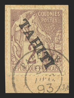 1160 p Yvert #19 ImageYvert #19, 1893 "1893/TAHITI" overprint on 1c Black on lilac blue, an especially well centered example tied to piece by full strike of 1893 Papeete c.d.s., extremely fine and choice; only 200 stamps were overprinted (Scott #17; $800.00). (Image) €950