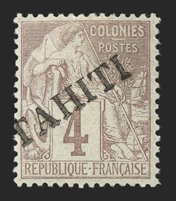 1156 og Yvert #9 ImageYvert #9, 1893 "TAHITI" overprint on 4c Claret on lavender, nicely centered, good color, o.g., h.r., very fine and scarce; only 200 stamps were overprinted; signed Calves and Gilbert and accompanied by 1983 Friedl certificate; ex-Neal Allen (Scott #7; $1,500.00). (Image) €1,700
