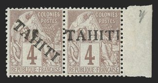 1157 og Yvert #9 ImageYvert #9, 1893 "TAHITI" overprint on 4c Claret on lavender, right sheet-margin horizontal pair, the left stamp with the usual diagonal overprint and the right stamp with horizontal overprint, very fresh and intact, o.g., tiny h.r., very fine and rare combination pair; only 200 stamps were overprinted; each signed Calves and Roumet and accompanied by 2010 Roumet certificate (Scott #7; $3,000.00 for singles). (Image) for singles €3,400+