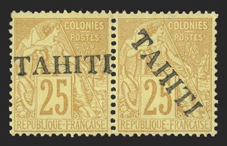 1158 og Yvert #14 ImageYvert #14, 1893 "TAHITI" overprint on 25c Yellow on straw, a fabulously rare mint combination horizontal pair, the right stamp with the usual diagonal overprint and the left stamp showing a horizontal overprint, strong and intact perforations, nicely centered with bright fresh color, o.g. with a bit of light toning, otherwise very fine; while 200 stamps were overprinted the great majority were used as postage and lost to philately; each signed J-F Brun, Calves and Lemaire and accompanied by 1998 Behr and 2004 Calves certificates; ex-Gilbert (Scott #12; $17,500.00). (Image) for singles €21,000+