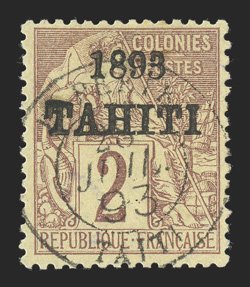 1161 O Yvert #20 ImageYvert #20, 1893 "1893/TAHITI" overprint on 2c Brown on buff, an attractive used example of this rare stamp, strong fresh color, neat 1893 Papeete postmark, very fine; only 200 stamps were overprinted; signed Bernichon, Calves and Miro twice (Scott #18; $2,750.00). (Image) €3,400
