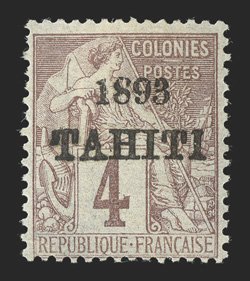 1163 og Yvert #21 ImageYvert #21, 1893 "1893/TAHITI" overprint on 4c Claret on lavender, another fresh mint single, rich color, o.g., h.r., fine and scarce; only 200 stamps were overprinted; signed Bernichon, A. Brun, Champion and Roumet (Scott #19; $1,850.00). (Image) €2,100