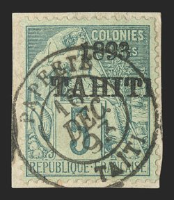 1164 p Yvert #22 ImageYvert #22, 1893 "1893/TAHITI" overprint on 5c Green on greenish, tied to small piece by perfectly struck 1893 Papeete c.d.s., well centered, rich color, very fine; only 550 stamps were overprinted; signed Gilbert & Koehler and Lemarie and accompanied by 2000 Behr certificate; ex-Gibralter (Scott #20; $950.00). (Image) €1,100