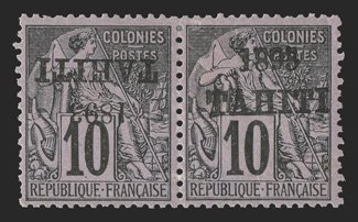 1166 og Yvert #23, 23a ImageYvert #23, 23a, 1893 "1893/TAHITI" overprint on 10c Black on lavender, inverted overprint, seldom seen horizontal combination pair, the left stamp the error, rich color on fresh paper, crisp and intact o.g., normal stamp paper h.r., the error l.h., very fine; only 850 stamps were overprinted and few combination pairs have survived; both signed Calves and Pavoille twice and accompanied by 1998 Behr certificate; ex-Gilbert (Scott #21, 21a; $1,300.00 for singles). (Image) for singles €1,520+