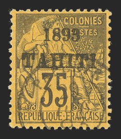 1167 O Yvert #28 ImageYvert #28, 1893 "1893/TAHITI" overprint on 35c Violet on orange, a select used example of this very scarce stamp, well centered, rich color on fresh paper, 1893 Papeete datestamp, very fine; only 150 stamps were overprinted; signed A. Brun and accompanied by 2002 Roumet certificate (Scott #26; $2,200.00). (Image) €2,600