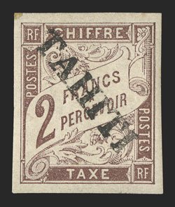 1171 ogO Yvert #TT14-26 ImageYvert #TT14-26, 1893 "1893/TAHITI" overprint on 1c-2Fr. Postage due, the complete set of all thirteen values, all mint except the 2c and 10c values with neat 1893 or 1894 Papeete postmarks and 30c value with a postmark in the top left margin, generally quite fresh, all with four mostly large margins, including several with sheet-margins, o.g., some h.r. and others l.h., 40c without gum, 2c shallow thin and 40c short tear, otherwise a very fine and choice set; rarely offered as a complete set as only 100 sets are possible; all signed at least once, but most often two or more times by Brun, Calves, Marguelet, Miro, et al (Scott #J14-26; $9,000.00). (Image) €11,390
