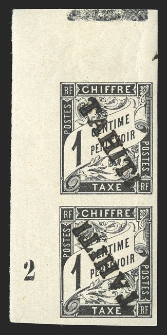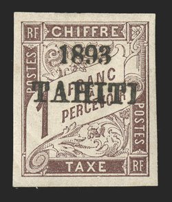 1169 nh Yvert #TT1, 1a ImageYvert #TT1, 1a, 1893 "TAHITI" overprint on 1c Black, inverted overprint, handsome and rare top left corner margin vertical combination pair, the bottom stamp the error, large margins, wonderfully fresh, o.g., h.r. in the selvage only, the stamps both never hinged, extremely fine; only 200 stamps were overprinted and few combination pairs exist today; each signed Calves and Bernichon (Scott #J1, J1a; $1,125.00 for hinged singles). (Image) for hinged €1,320+