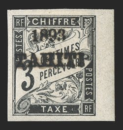 1172 og Yvert #TT16 ImageYvert #TT16, 1893 "1893/TAHITI" overprint on 2c Black, exceptionally fresh right sheet-margin mint single, with oversized margins on the other three sides, o.g., light h.r., extremely fine; only 200 stamps were overprinted; signed Roumet (Scott #J16; $550.00). (Image) €680