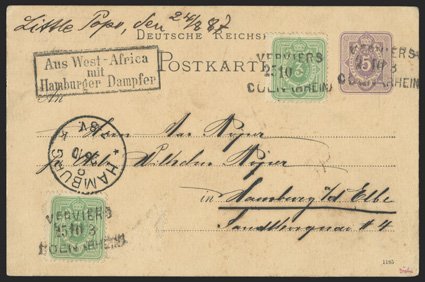 1174 c   Image1885 Forerunner card, Germany 5pf Violet postal card, additionally franked with two 3pf Green, all tied by straight line "VERVIERS/25 10 3/COLN RHEIN" railroad handstamps, card originated in Little Popo, with ms. notation at top and boxed "Aus West-Africa/mit/Hamburger Dampfer" handstamp, sent to Hamburg with c.d.s. arrival postmark, fine and a rare usage; signed Drahn and accompanied by 2002 Briefmarkenprufstelle Basel certificate. (Image) Est. $500-750