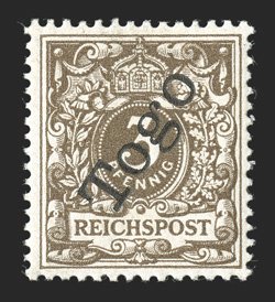 1177 ogOc   Balance of the German Togo, with about fifteen forerunners used or on piece, mainly the 1889-1900 Issues, including two shades of the 2M, some 50pf including three on one piece, a few better cancels and one cover, the issued stamps include a complete run of mint, including mint never hinged strips of three of the 1909-19 Issue, also extensive used, including two 5M stamps and a wide variety of cancellations, plus a few covers or cards, also three items from German Zanzibar, including two 20pf on cover and a strip of three of the 50pf tied to piece (Michel #50b; Steuer cert.), largely fine-very fine; an interesting lot that should be carefully viewed. Est. $1,000-1,500