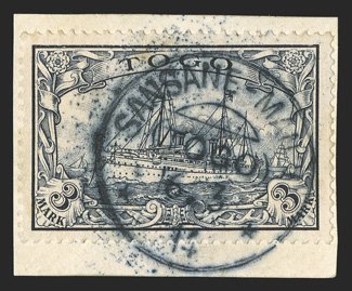 1176 p Mi #18 ImageMichel #18, 1900 3M Violet black, tied to piece by a complete strike of the rare "SANSANE-MANGU, TOGO/16.3.14. c.d.s., both the stamp and the cancel are very fine; 2001 Steuer certificate (Scott #18). (Image) Est. $300-400