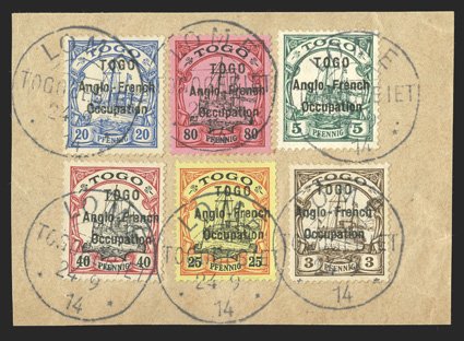 1178 p S.G. #H1/9 ImageS.G. #H1-2, 4-5, 7, 9, 3pf-80pf Wide setting overprints, tied to one piece by Lome 24.9.14 (the second day of use), all are well centered and fresh, very fine; 1980 BPA certificate (Scott #35-36, 38-39, 41, 43; $842.50). (Image) £803