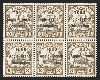 1179 nhbl S.G. #H1 ImageS.G. #H1, 1914 "TOGO/Anglo-French/Occupation" overprint on 3pf Brown, wide setting, exceedingly choice mint block of six, possible pos. 44-46/4-6 from the setting, wonderfully well centered, o.g., never hinged, extremely fine; each signed Kilian BPP (Scott #35; for hinged $780.00+). (Image) for hinged £720+