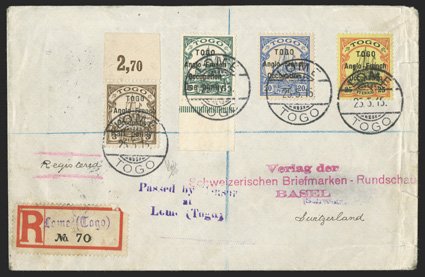 1181 c S.G. #H4/13 ImageS.G. #H4, 5, 12, 13, 1914 20pf, 25pf, ½p on 3pf and 1p on 5pf Overprints, singles of each tied by Lome 25.5.15 c.d.s. postmarks on registered cover to Switzerland (backstamp receivers), surcharged stamps are margin copies, cover with small edge tears at right, stamps are very fine; signed Holcombe; the used stamps alone catalog £368. (Image) Est. $400-500