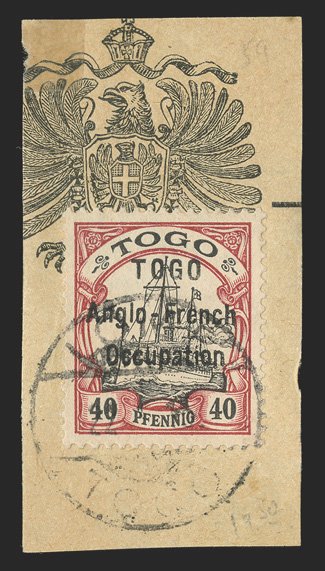1195 p S.G. #H20 ImageS.G. #H20, 1914 "TOGO/Anglo-French/Occupation" overprint on 40pf Black and carmine, narrow setting, fresh used example tied to piece by Lome 20.10.14 c.d.s., bright colors, well centered, very fine; another rare value of this setting, Gibbs estimates that only about 25 or 30 stamps were issued, signed Kosack, Buhler, A.Diena, and accompanied by a 1984 BPA certificate (Scott #54; $1,750.00). (Image) £1,600