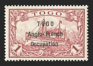 1197 nh S.G. #H22 ImageS.G. #H20, 1914 "TOGO/Anglo-French/Occupation" overprint on 80pf Black and carmine on rose, narrow setting, a remarkable quality mint example of this rarity, being exceptionally well centered and with beautiful vibrant colors, o.g., never hinged, small pencil note on gum, extremely fine; according to Gibbs only 25 of this value was printed, and he records just six mint singles, the example here is probably the finest of those six (Scott #56; for hinged $2,100.00). (Image) for hinged £2,500