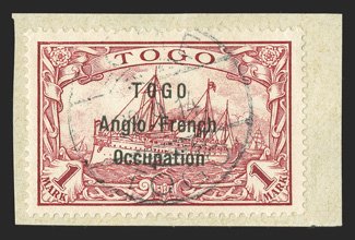1185 p S.G. #H10 ImageS.G. #H10, 1914 (Sept.) "TOGO/Anglo-French/Occupation" overprint on 1M Carmine, wide setting overprint, tied to piece by Lome 29.9.14 c.d.s., well centered, bright color, very fine; a rare stamp of which 100 in total were printed between the two settings; signed Kilian BPP and accompanied by his 1983 certificate (Scott #44; $2,800.00). (Image) £2,500