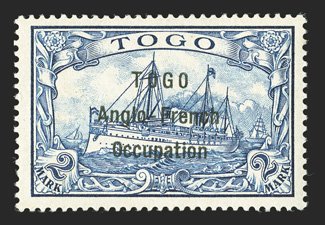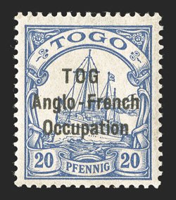 1193 og S.G. #17a ImageS.G. #H17a, 1914 "TOGO/Anglo-French/Occupation" overprint on 20pf Ultramarine, narrow setting, "TOG" error, handsome mint example of this rare error, wonderfully bright and fresh, well centered, o.g., mild h.r., very fine; this error occurred only once in the sheet, therefore no more than 40 can exist, and Gibbs estimates half the existing population are used; signed H. Bloch (Scott #51a; $4,750.00). (Image) £3,500