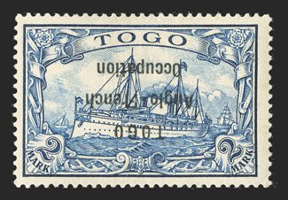 1187 og S.G. #H11b ImageS.G. #H11b, 1914 "TOGO/Anglo-French/Occupation" overprint on 2M Blue, overprint inverted, a wonderfully fresh and choice mint example of this error rarity, with deep luxuriant color on fresh white paper, o.g., lightly hinged, very fine; only one sheet of twenty stamps was printed with the inverted overprint, all are mint; signed Holcombe and accompanied by his 1991 certificate (Scott #45a; unpriced). (Image) £12,000