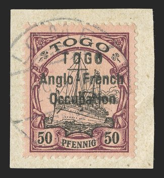 1196 p S.G. #H21 ImageS.G. #H21, 1914 "TOGO/Anglo-French/Occupation" overprint on 50pf Black and purple on buff, narrow setting, used single tied to piece by Lome 29.9.14 c.d.s., intense colors, nicely centered, very fine; an extraordinarily rare stamp, as Gibbs estimates only twenty were printed and fewer than that number have been recorded, all used; signed A. Brun (Scott #55; $6,750.00). (Image) £7,500