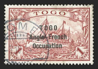 1198 O S.G. #H23 ImageS.G. #H23, 1914 "TOGO/Anglo-French/Occupation" overprint on 1M Carmine, narrow setting, used example of this rare stamp, with neat Lome 7.10.14 c.d.s., bright color, well centered, very fine; Gibbs estimates that only 40 stamps were issued, and though most were used, certainly less exist today; 1958 Mohrmann and 1984 Kilian certificates (Scott #57; $4,500.00). (Image) £4,000