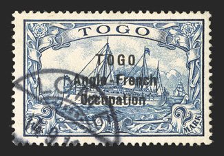 1199 O S.G. #H24 ImageS.G. #H24, 1914 "TOGO/Anglo-French/Occupation" overprint on 2M Blue, narrow setting, lovely used single of this incredibly rare value in the narrow setting, being very well centered and bearing a portion of Lome c.d.s., color is deep and intense on fresh crisp paper, extremely fine; while no more than twenty stamps were originally printed, no examples are known unused, and only 12 used examples have been recorded, one of which is in the Royal Collection; 1992 Holcombe certificate; ex-Bute, Neal Allen (Scott #58; $10,000.00). (Image) £10,000