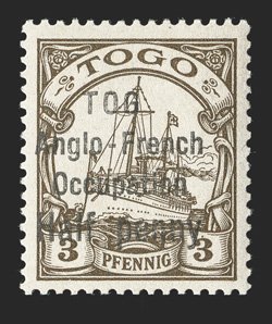 1190 O S.G. #H14 ImageS.G. #H14, 1914 "TOGO/Anglo-French/Occupation" overprint on 3pf Brown, narrow setting, used, rich color, neat c.d.s. cancel, very fine; Gibbs notes that this is a very rare stamp, and estimates only about 25 stamps were issued making this immensely rare and undercataloged; signed Holcombe (Scott #48; $1,000.00). (Image) £950