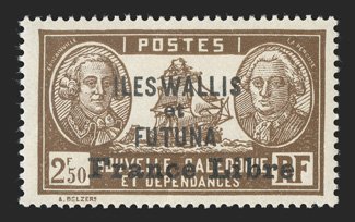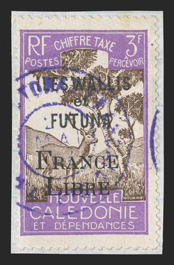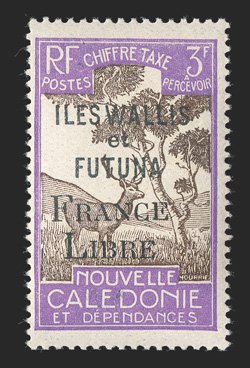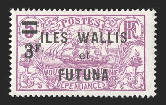 1241 og Yvert #37b ImageYvert #37b, 1924 "ILES WALLIS/et/FUTUNA" overprint and "3f" surcharge on 5Fr. Red violet, double "3f" surcharge, well centered and exceptionally fresh, o.g., l.h., very fine (Scott #40b; $325.00). (Image) €320